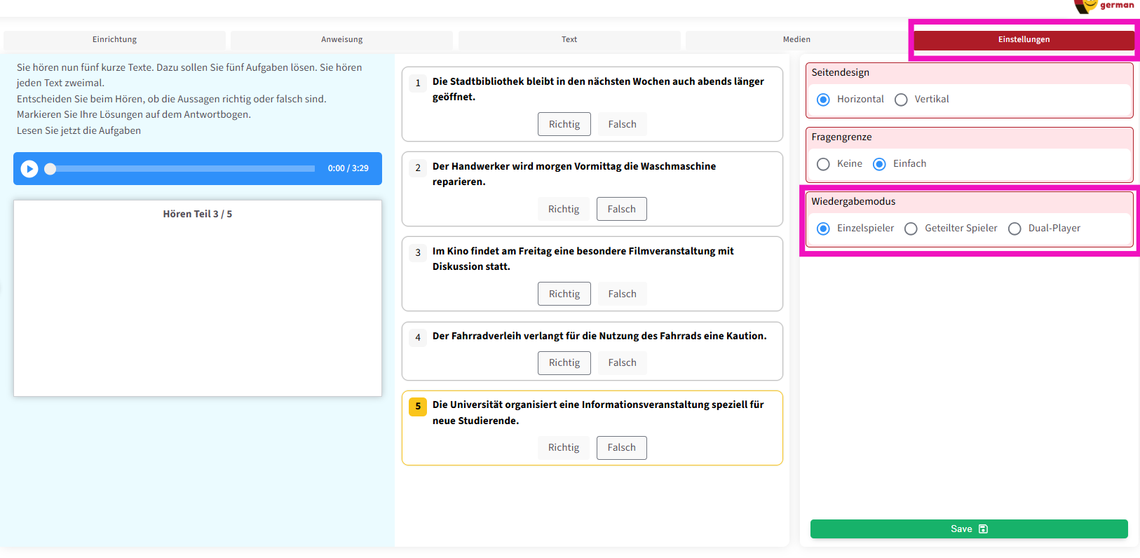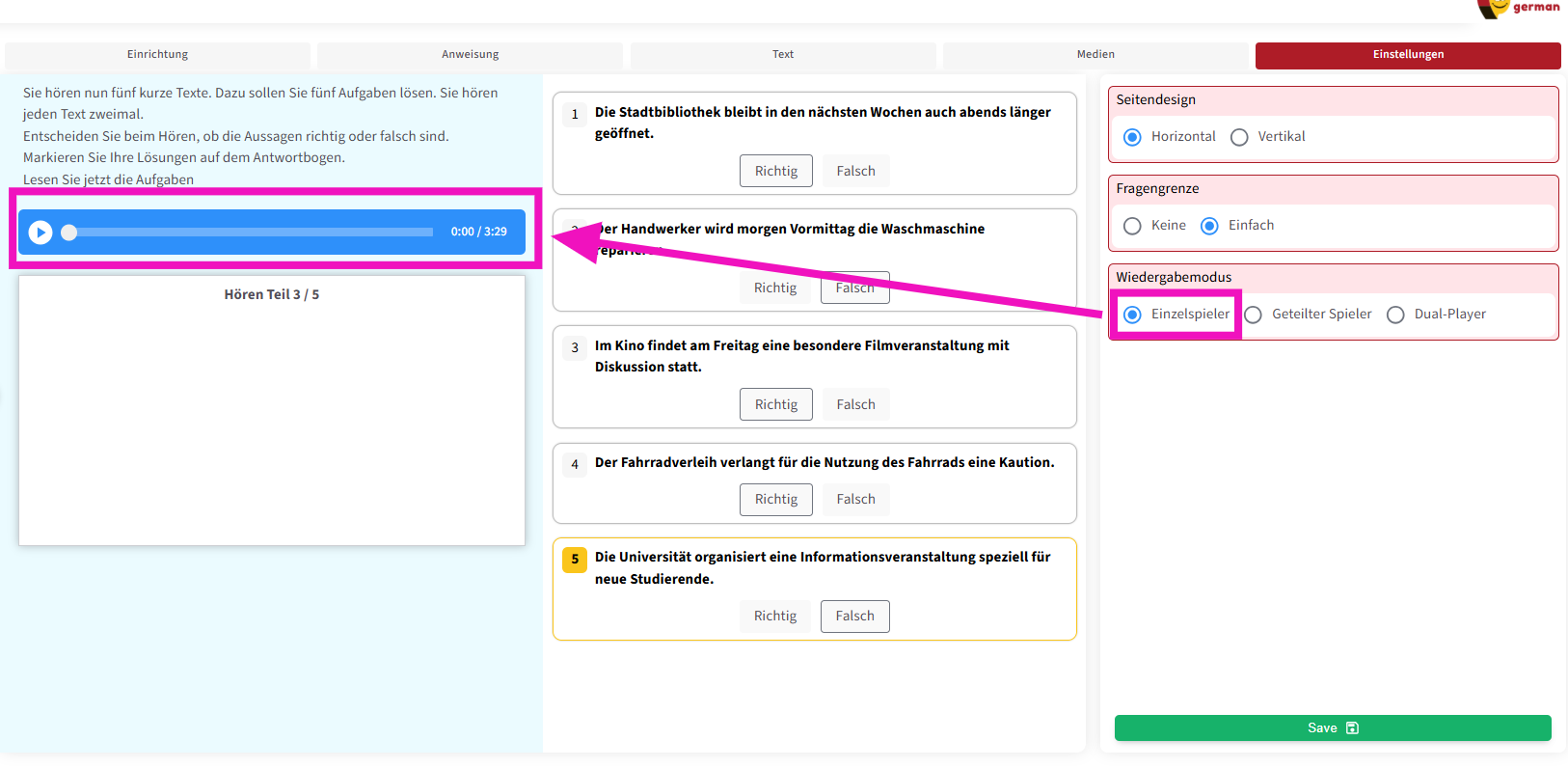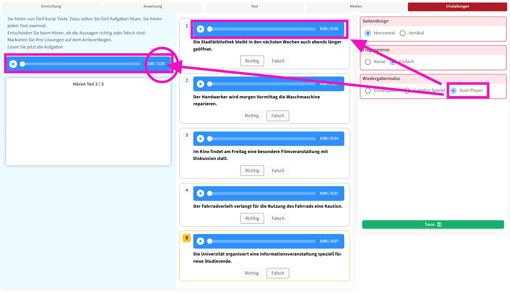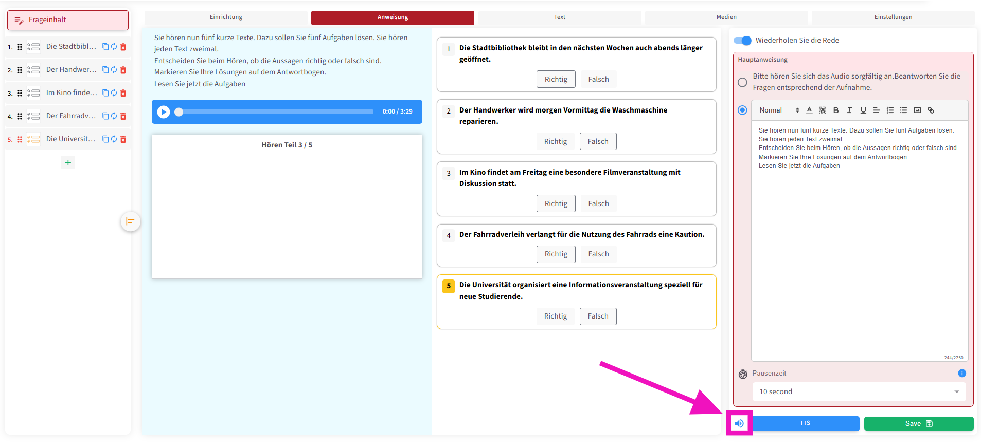 Die zweite Funktion ermöglicht es, die Prüfungsanweisung auch als Audio abzuspielen . Außerdem können – wie in echten Prüfungen – Pausen zwischen den Fragen eingefügt werden, damit die Lernenden ausreichend Zeit haben, die Fragetexte zu lesen .