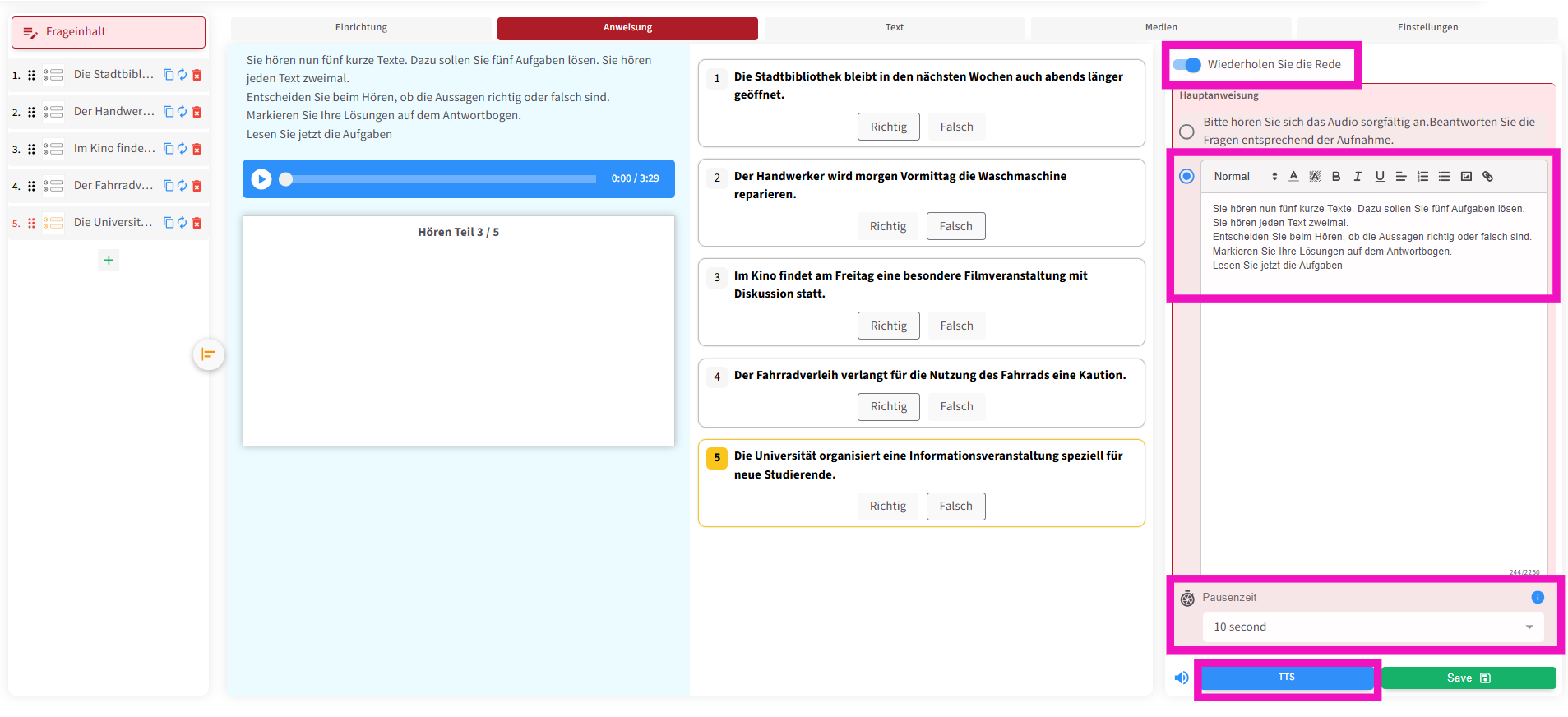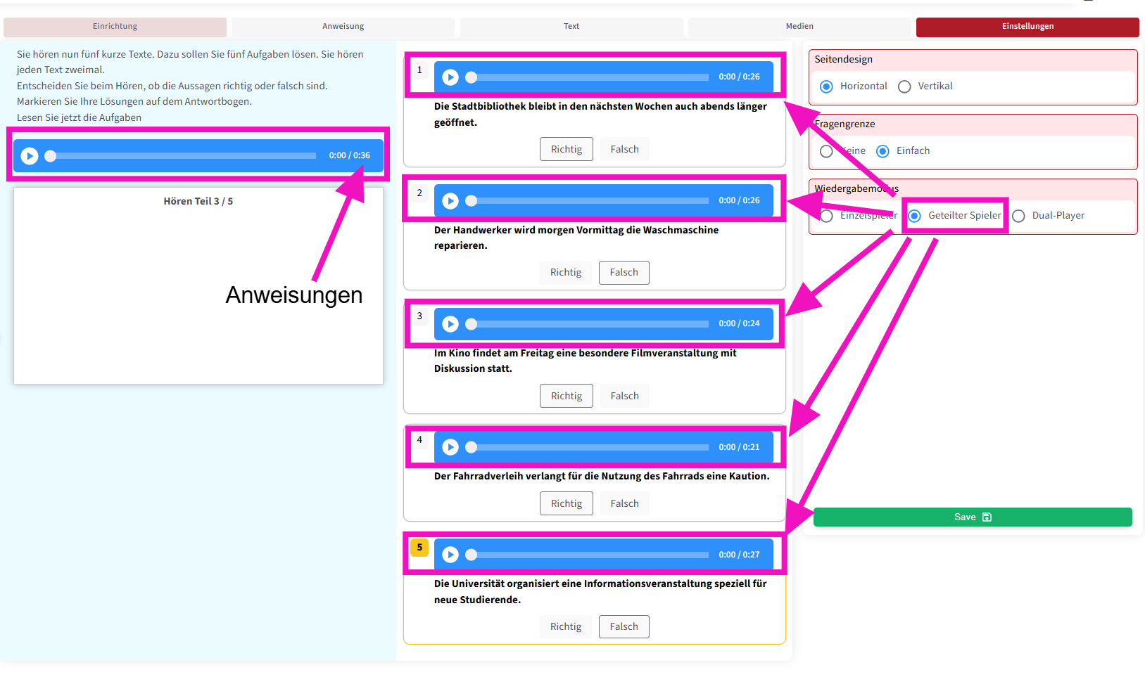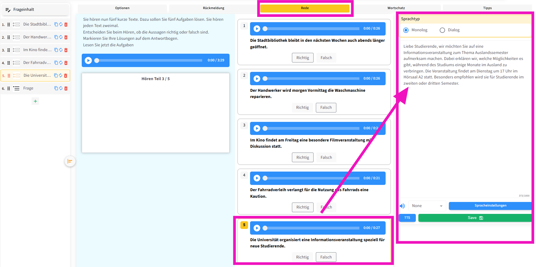 Die zweite Funktion ermöglicht es, die Prüfungsanweisung auch als Audio abzuspielen . Außerdem können – wie in echten Prüfungen – Pausen zwischen den Fragen eingefügt werden, damit die Lernenden ausreichend Zeit haben, die Fragetexte zu lesen .