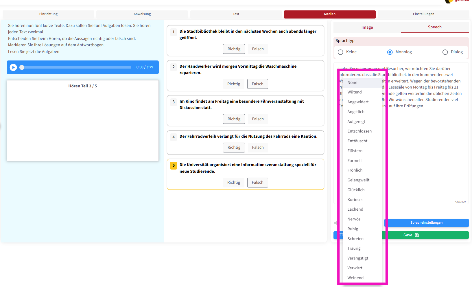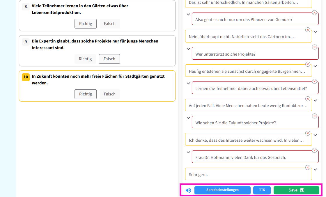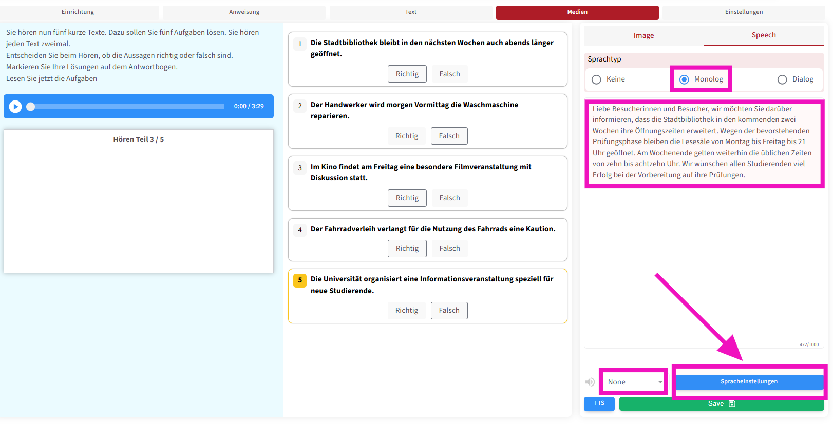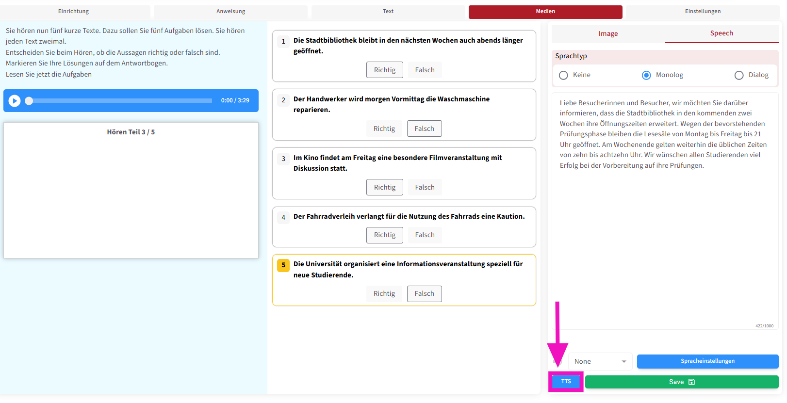 Die zweite Funktion ermöglicht es, die Prüfungsanweisung auch als Audio abzuspielen . Außerdem können – wie in echten Prüfungen – Pausen zwischen den Fragen eingefügt werden, damit die Lernenden ausreichend Zeit haben, die Fragetexte zu lesen .