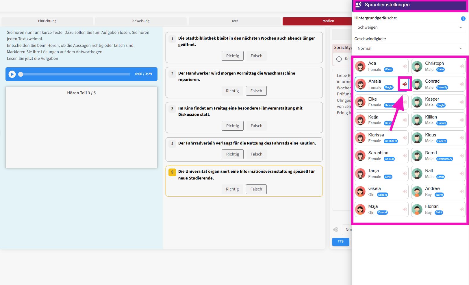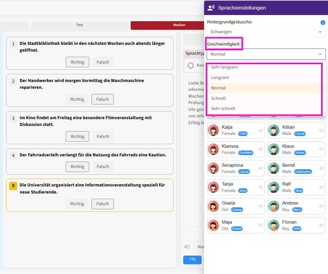 Detaillierte Audioeinstellungen können Sie im Bereich „Spracheinstellungen“ vornehmen. Je nach Art der Aufgabe können Sie Charaktere mit unterschiedlichen Stimmklängen auswählen , die Sprechgeschwindigkeit anpassen und ein Hintergrundgeräusch festlegen .