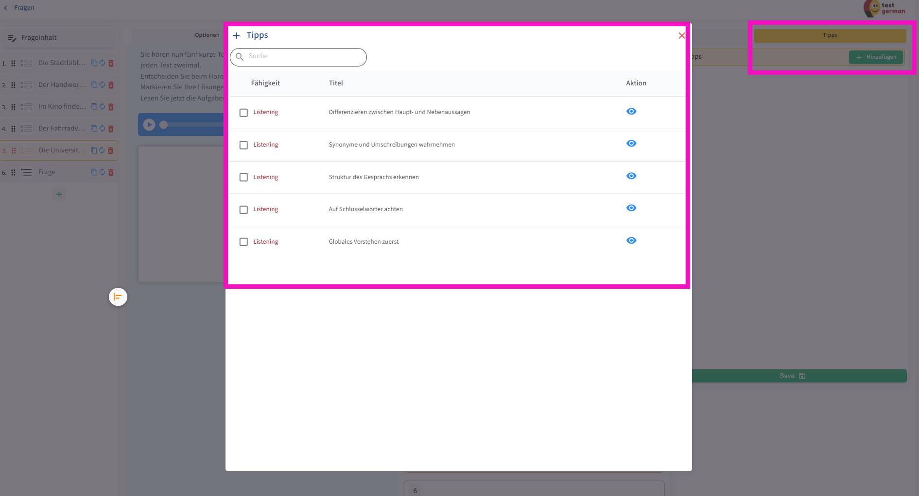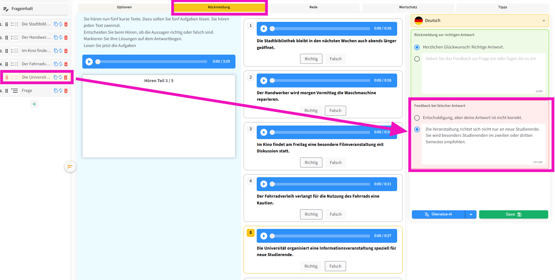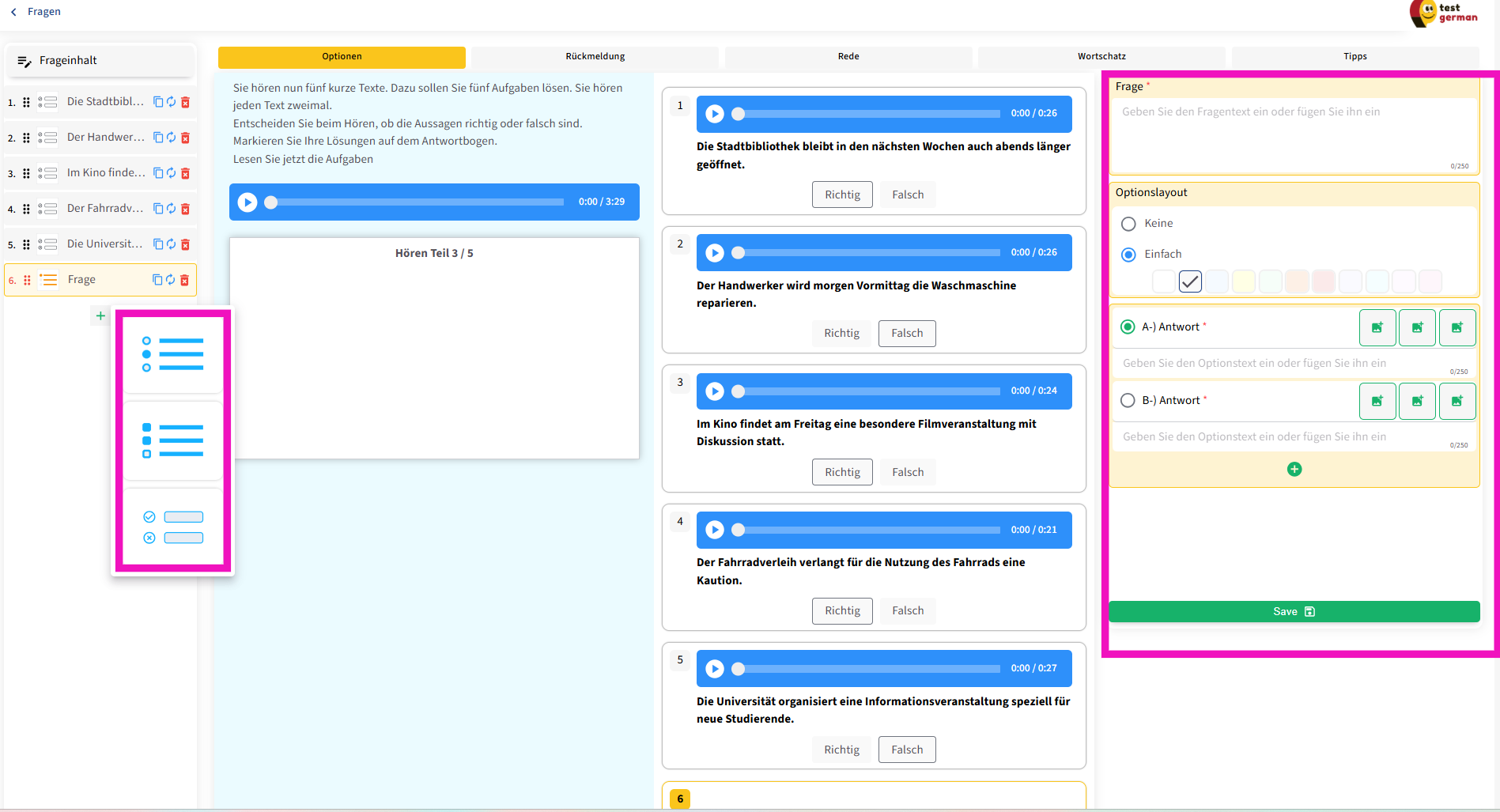 Die Struktur der Hören-Aufgaben ist so aufgebaut, dass für jede Frage eine Audiodatei hinzugefügt wird. Dies wird in den folgenden Abschnitten noch genauer erläutert.