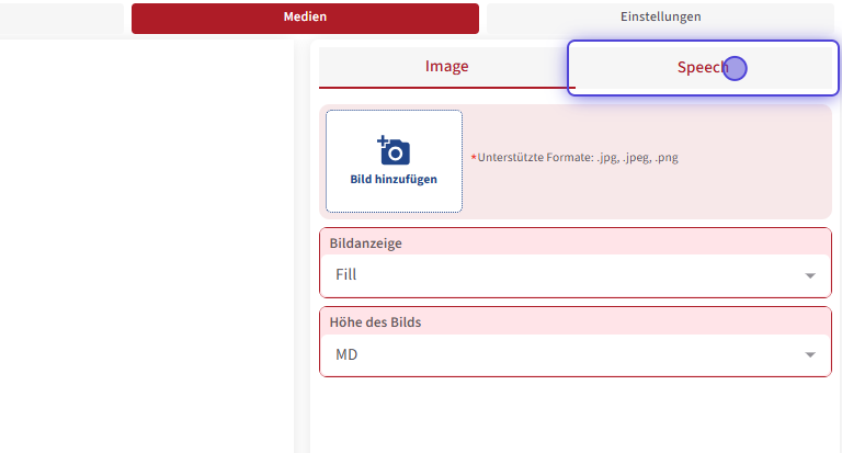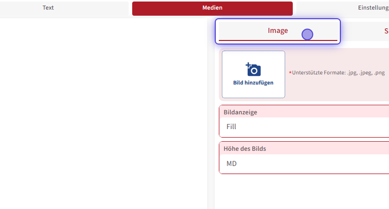 Der Bereich „Medien“ ist grundsätzlich ähnlich aufgebaut. Neben dem Hinzufügen von Bildern gibt es hier zusätzlich die Möglichkeit, Audiodateien einzufügen . Im Folgenden wird dieser Bereich näher erläutert.