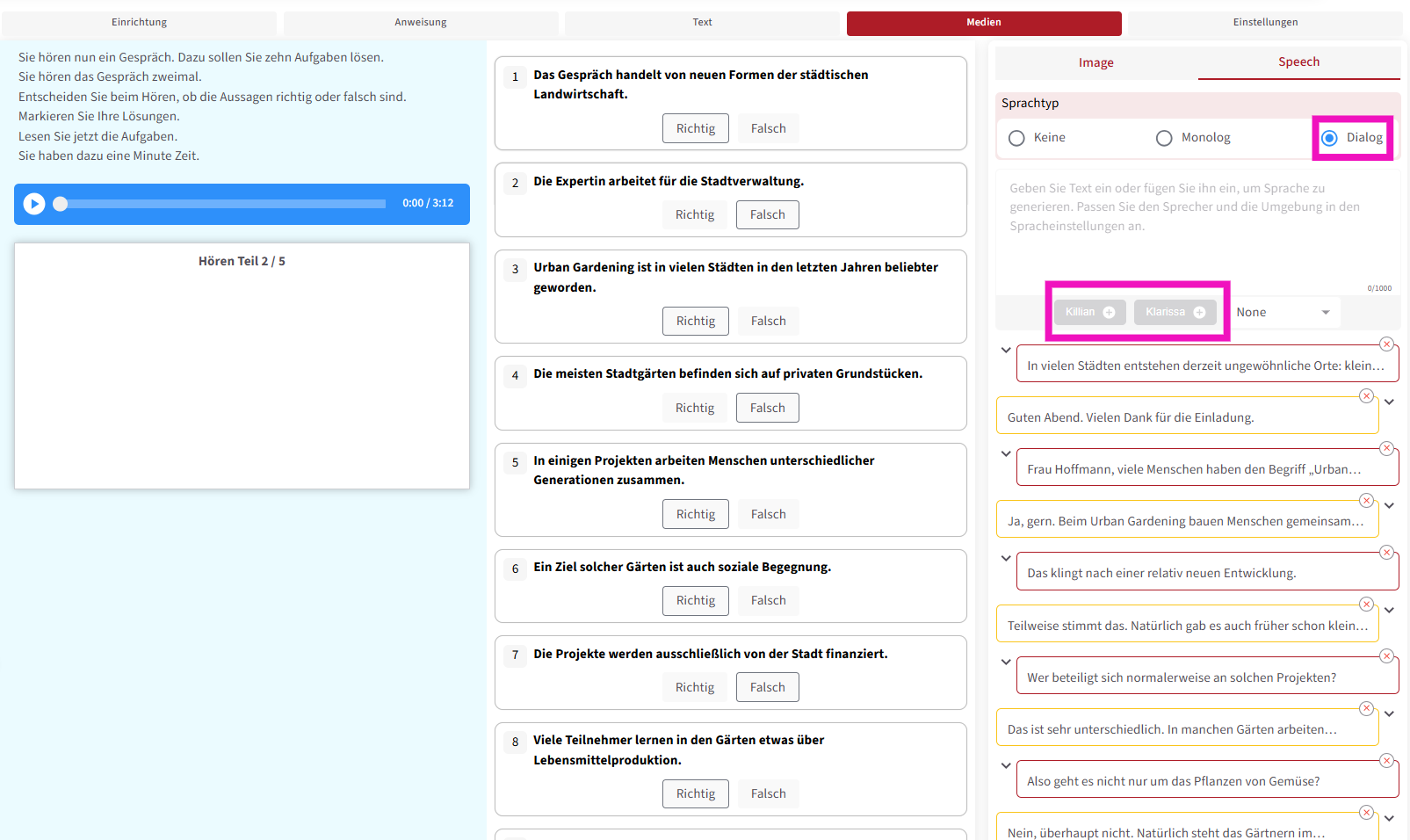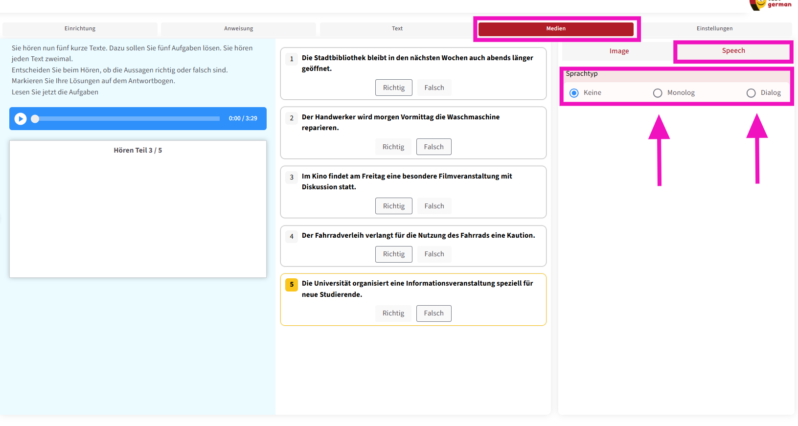In manchen Fällen kann es jedoch notwendig sein, mehrere Fragen zu einer einzigen Audiodatei zu erstellen. Für diesen Zweck wurde der Bereich „Speech“ entwickelt.