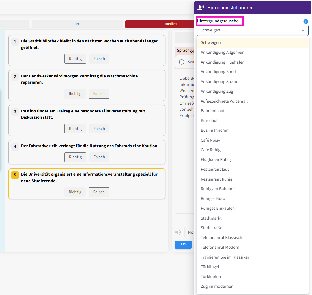 Die Hintergrundgeräusche wurden anhand der häufigsten Szenarien in Deutschprüfungen und Unterrichtsmaterialien ausgewählt. Sie können eines dieser Geräusche auswählen und ebenfalls vorab testen .