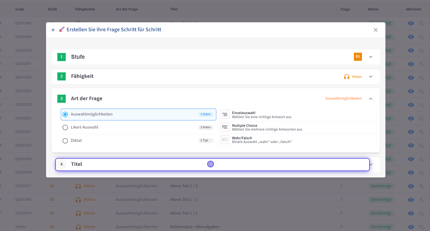 Beim Fragetyp Hören stehen Multiple Choice , Likert und Diktat als Übungsformate zur Verfügung. Sie können den gewünschten Fragetyp auswählen.