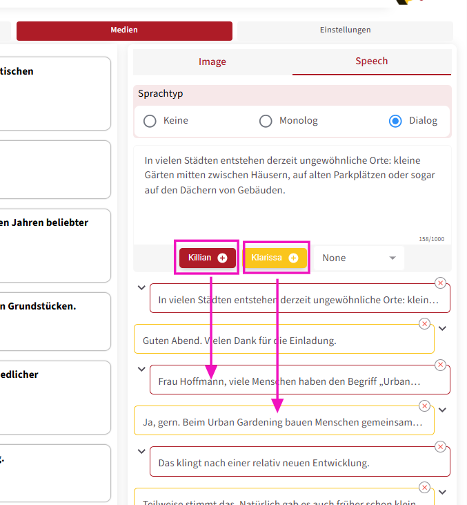 Im Bereich „Dialog“ können Sie die Stimmen von zwei miteinander sprechenden Charakteren erstellen. Nachdem Sie den Sprechtext jedes Charakters in den Editor eingegeben haben, können Sie durch Klicken auf den jeweiligen Charakter die entsprechende Stimme hinzufügen .