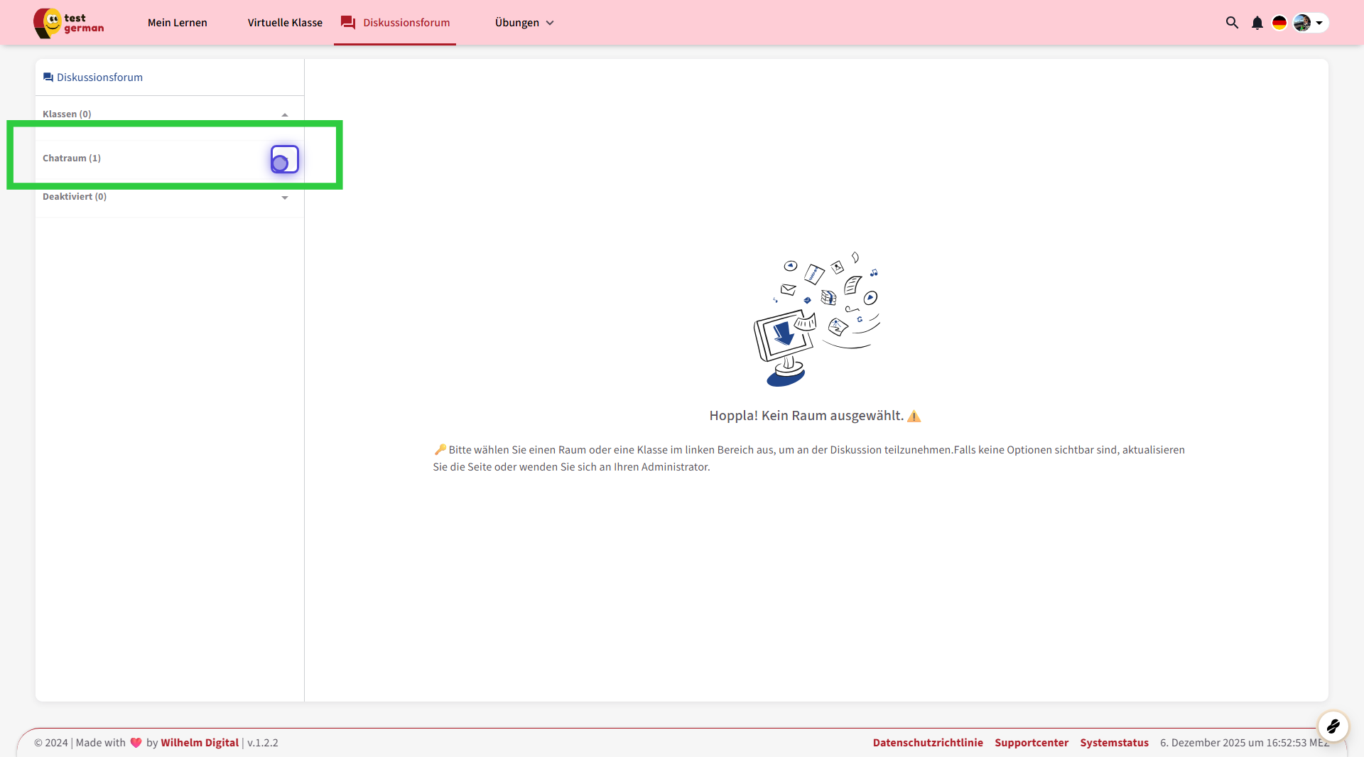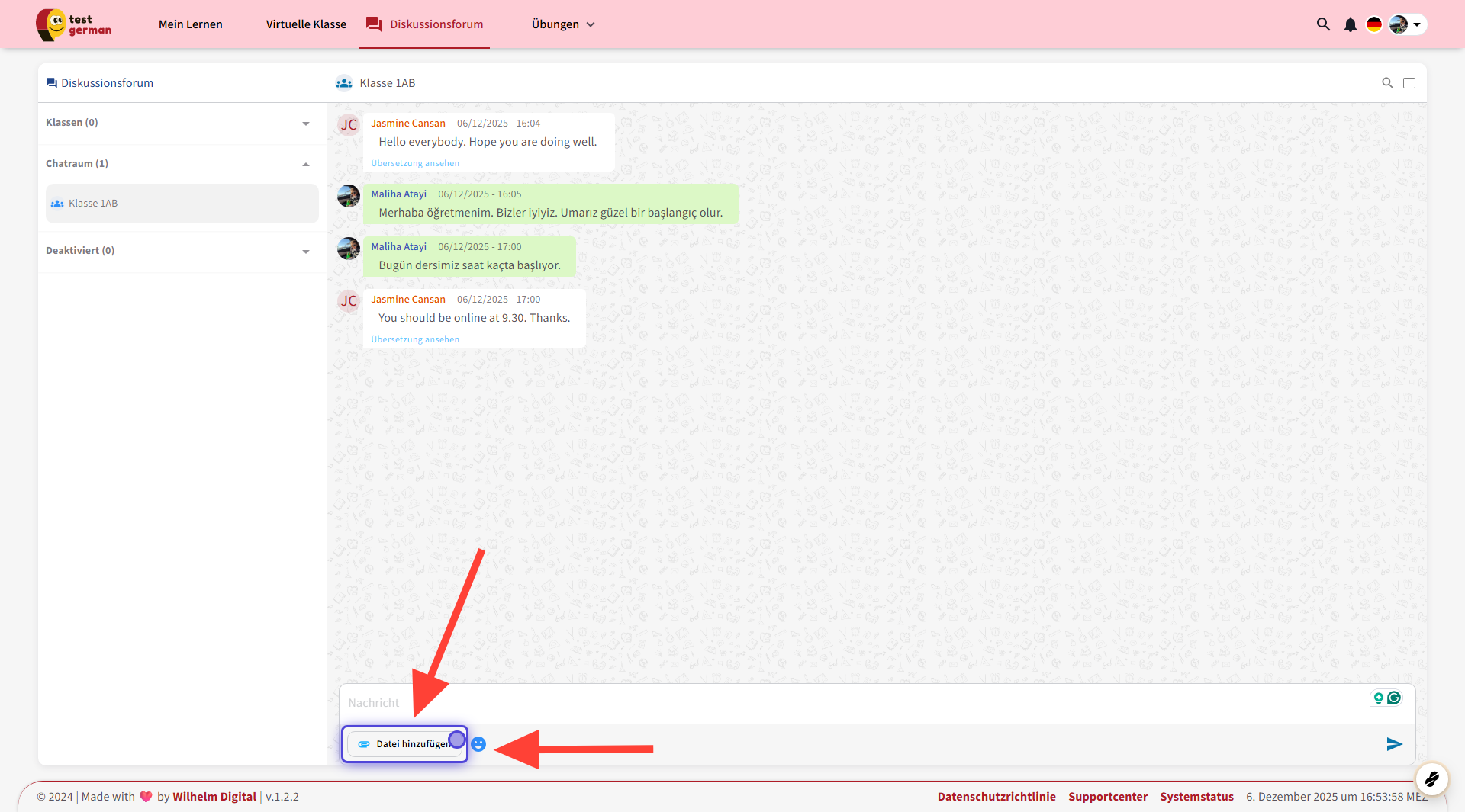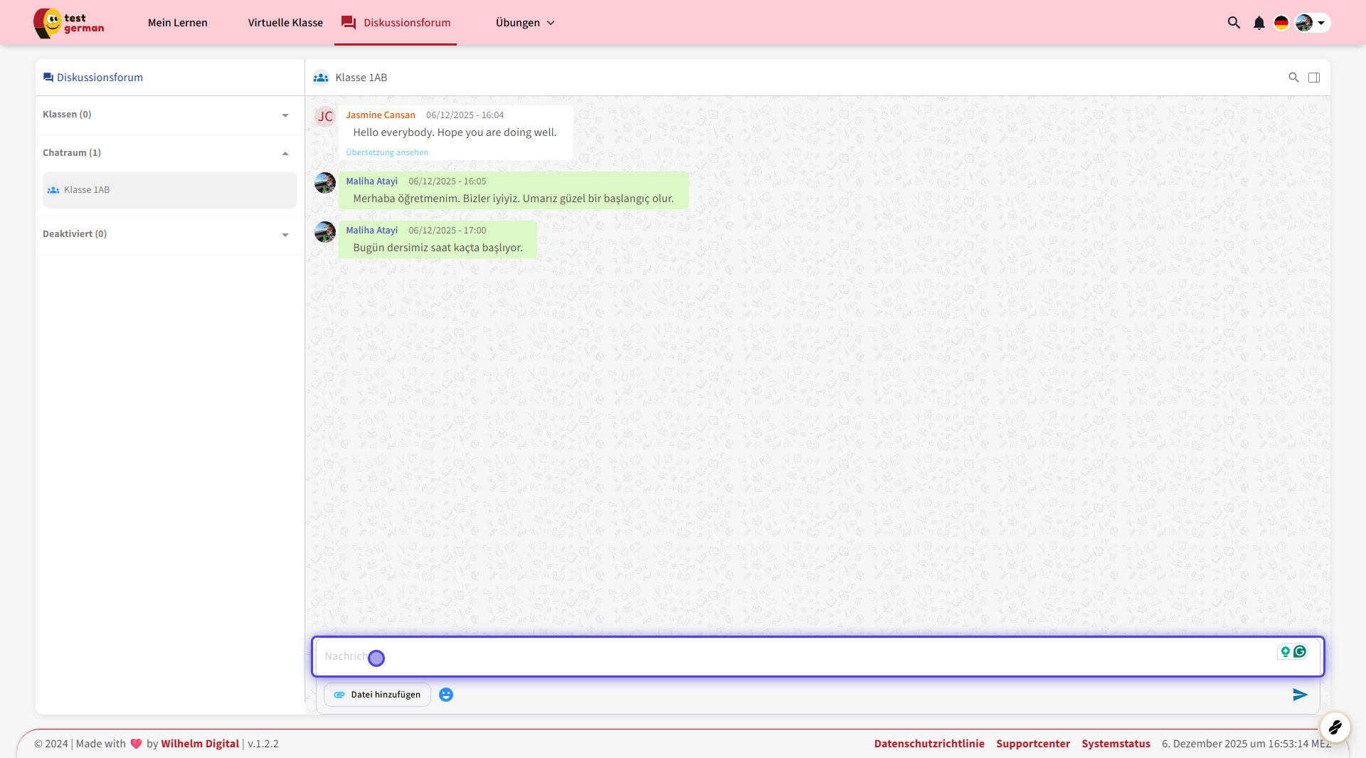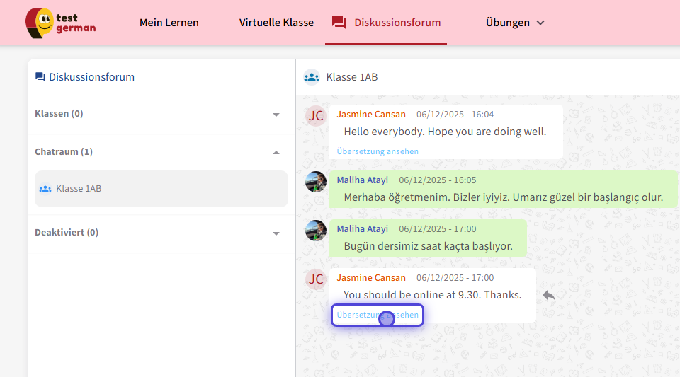 Nur die Lernenden, die diesem Chatraum hinzugefügt wurden, können diesen Chat sehen und daran teilnehmen.