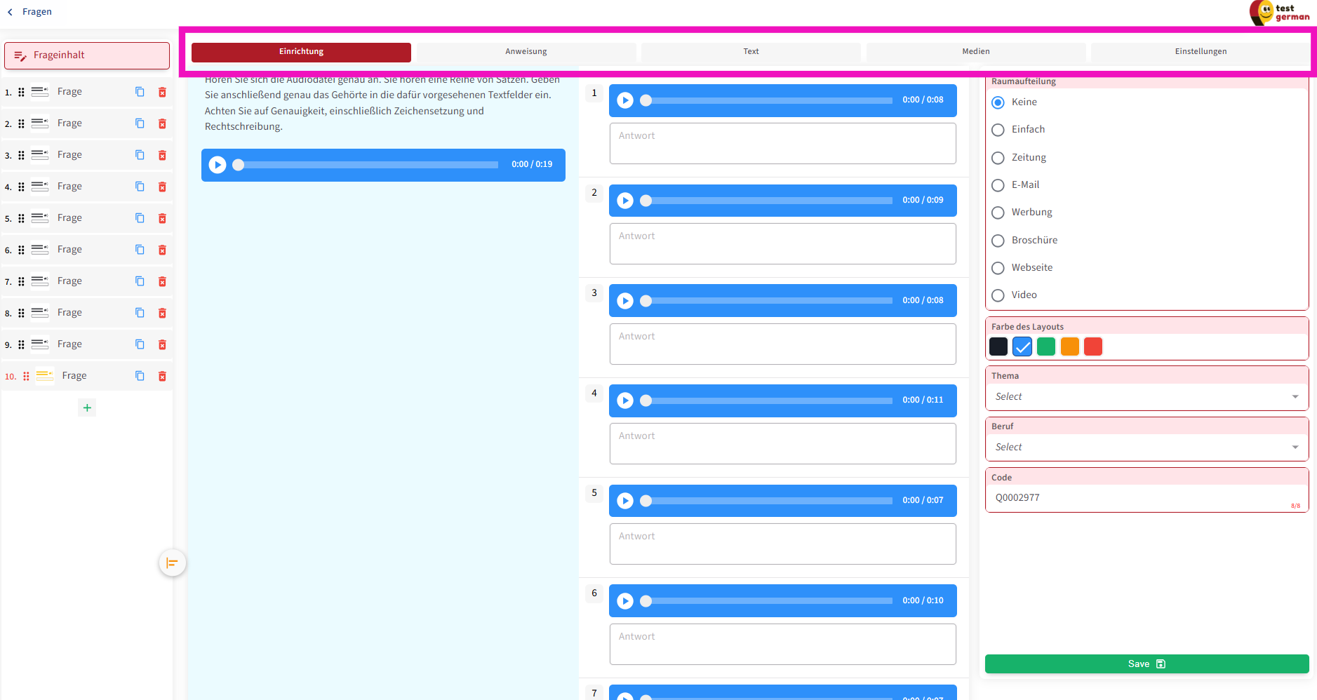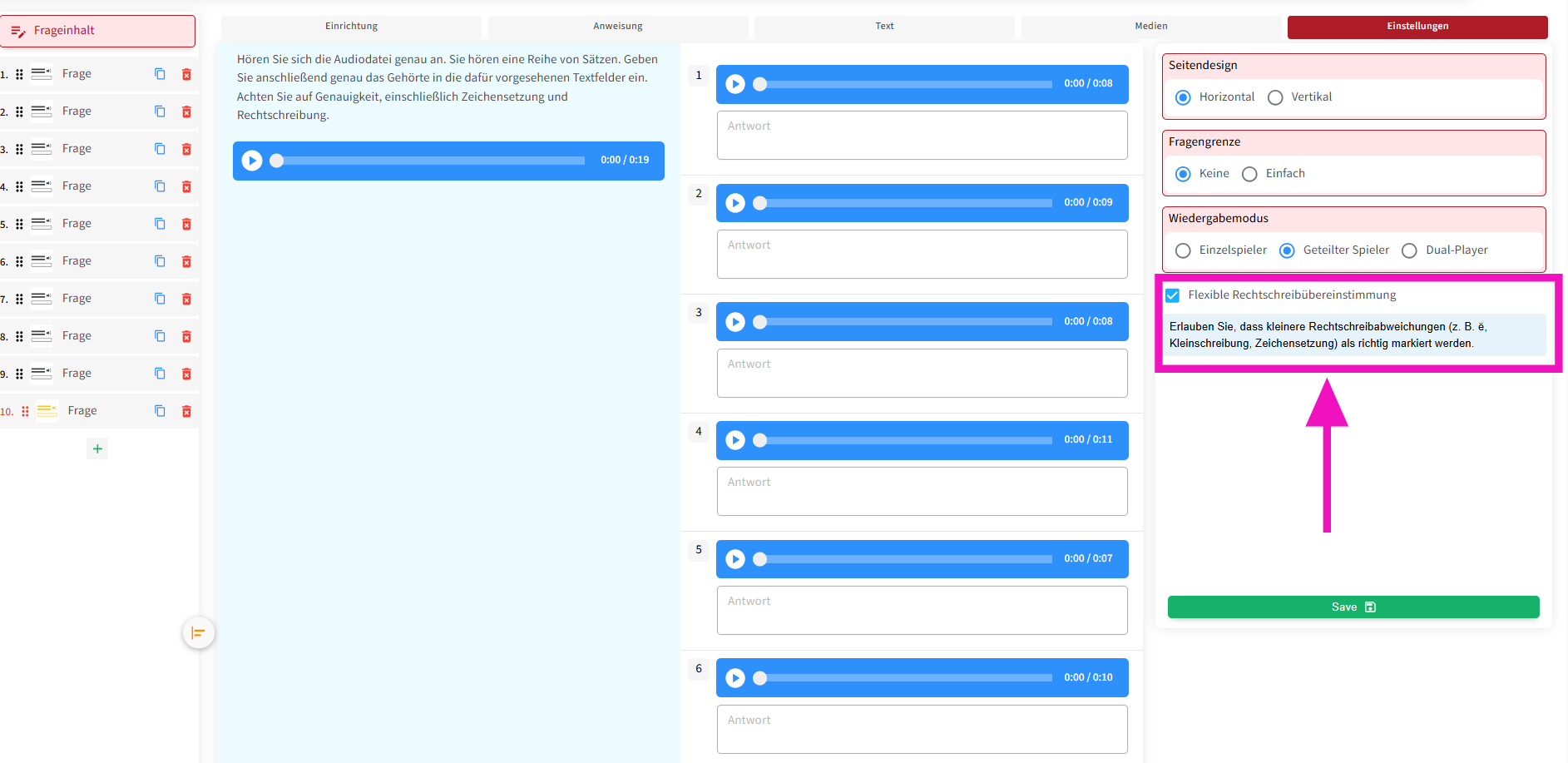 Die Audioeinstellungen sind vollständig identisch mit denen der anderen Fragetypen und können nach Wunsch angepasst werden.