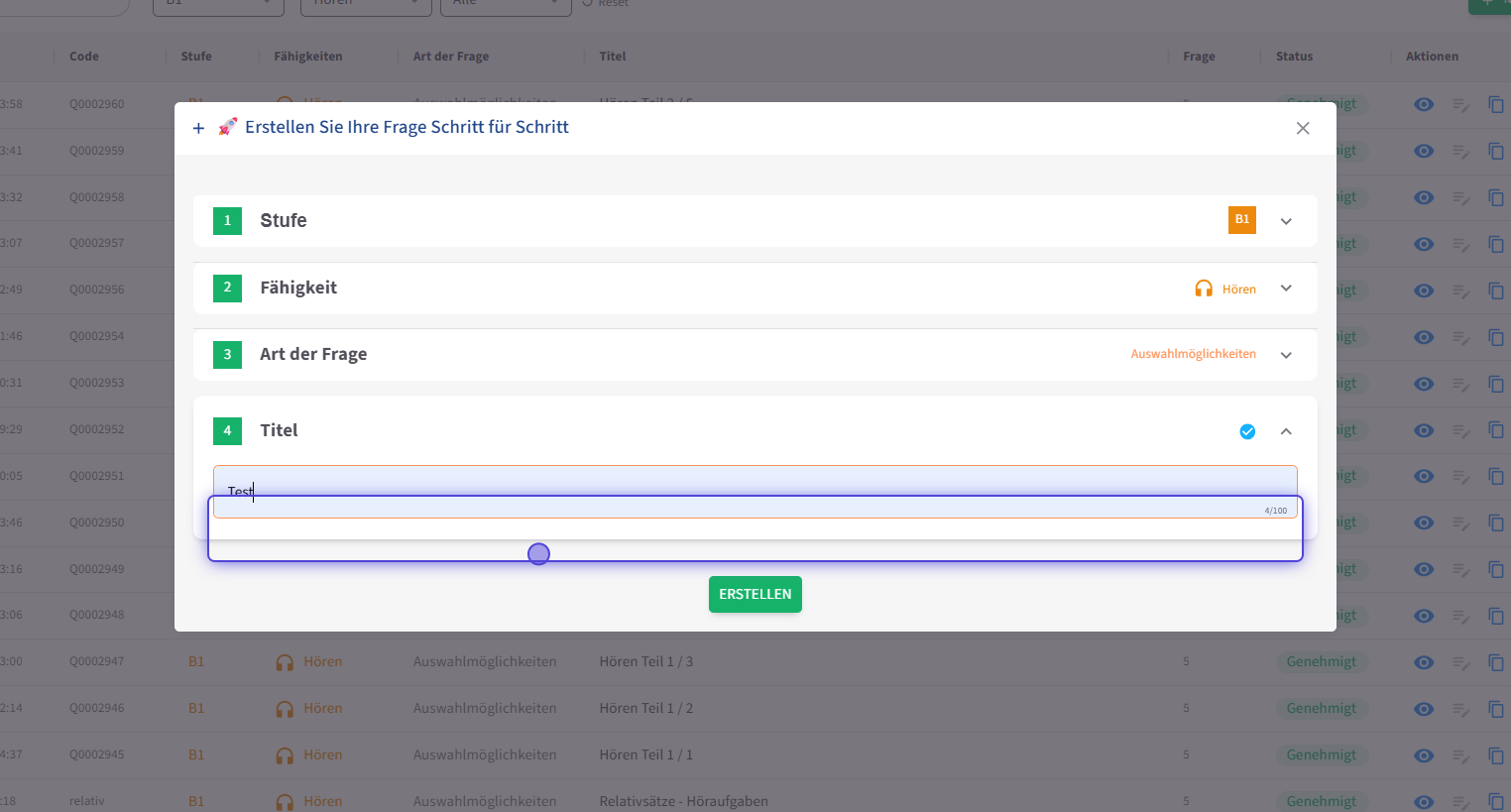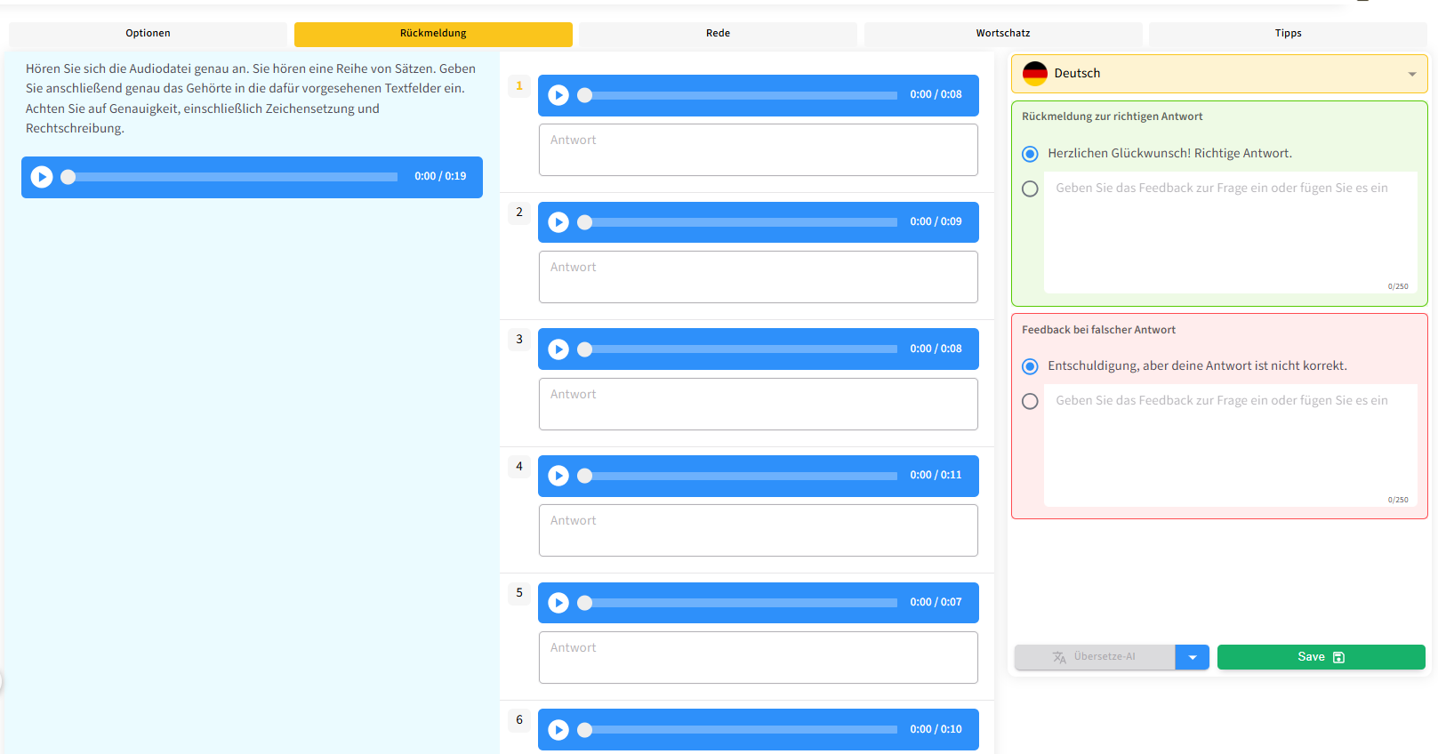 Dieser Fragetyp dient dazu, Hörverstehen, Rechtschreibung und Sprachgenauigkeit gleichzeitig zu trainieren. Die Erstellung der Aufgabe erfolgt grundsätzlich ähnlich wie bei den anderen Hören-Fragetypen , wobei der Fokus hier auf der korrekten Verschriftlichung des gehörten Textes liegt.