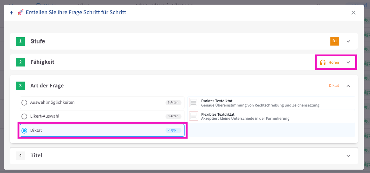 Beim Fragetyp Hören stehen Multiple Choice , Likert und Diktat als Übungsformate zur Verfügung. Sie können den gewünschten Fragetyp auswählen.