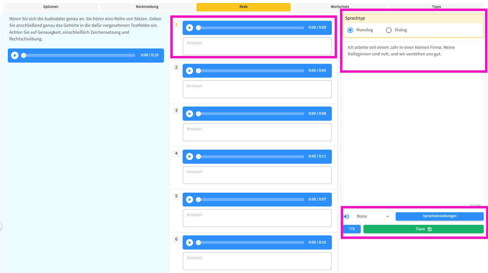 Der Text, den die Lernenden anhören sollen, wird als Monolog im Bereich „Rede“ eingegeben und anschließend per TTS in Audio umgewandelt. Die erzeugte Audiodatei kann über die Audioleiste oberhalb der Frage angehört werden.
