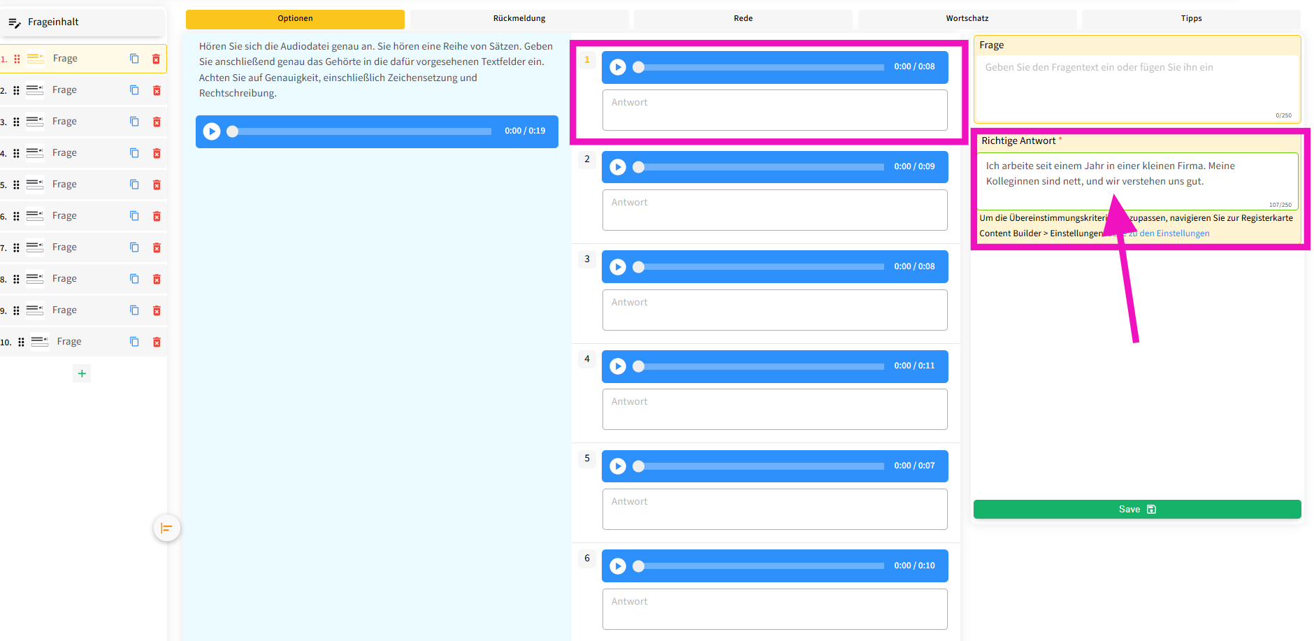 Bei Diktatübungen unterscheidet sich das Hinzufügen von Fragen etwas von den anderen Fragetypen. In diesem Fall ist es nicht zwingend erforderlich, einen Fragetext einzugeben , da die Aufgabe darin besteht, einen Hörtext anzuhören und ihn schriftlich wiederzugeben .