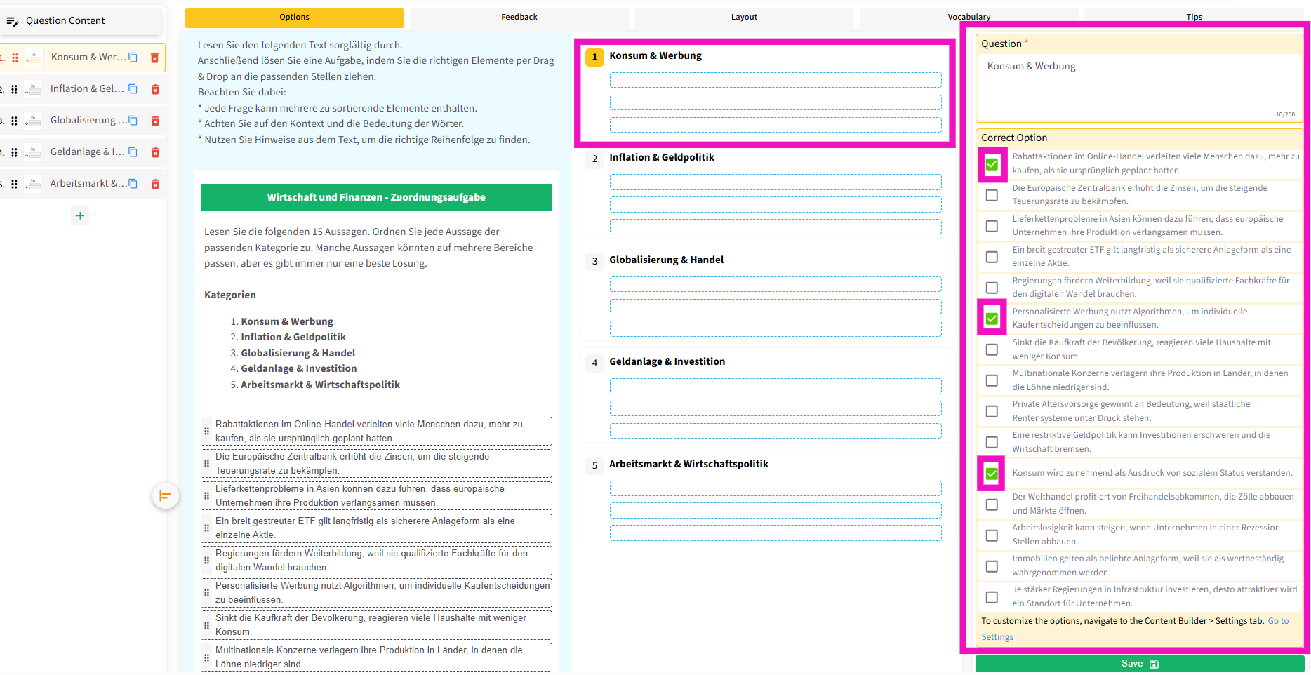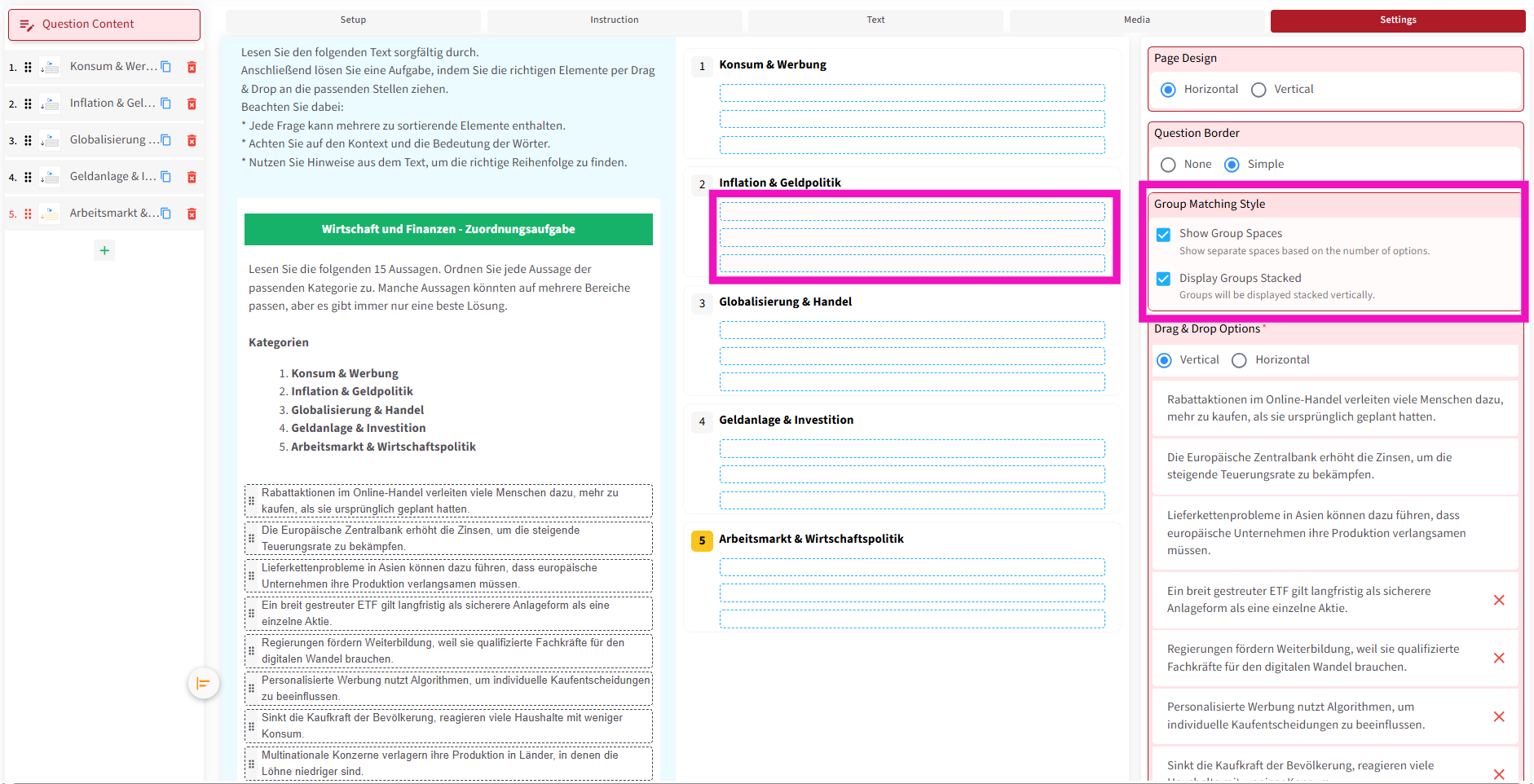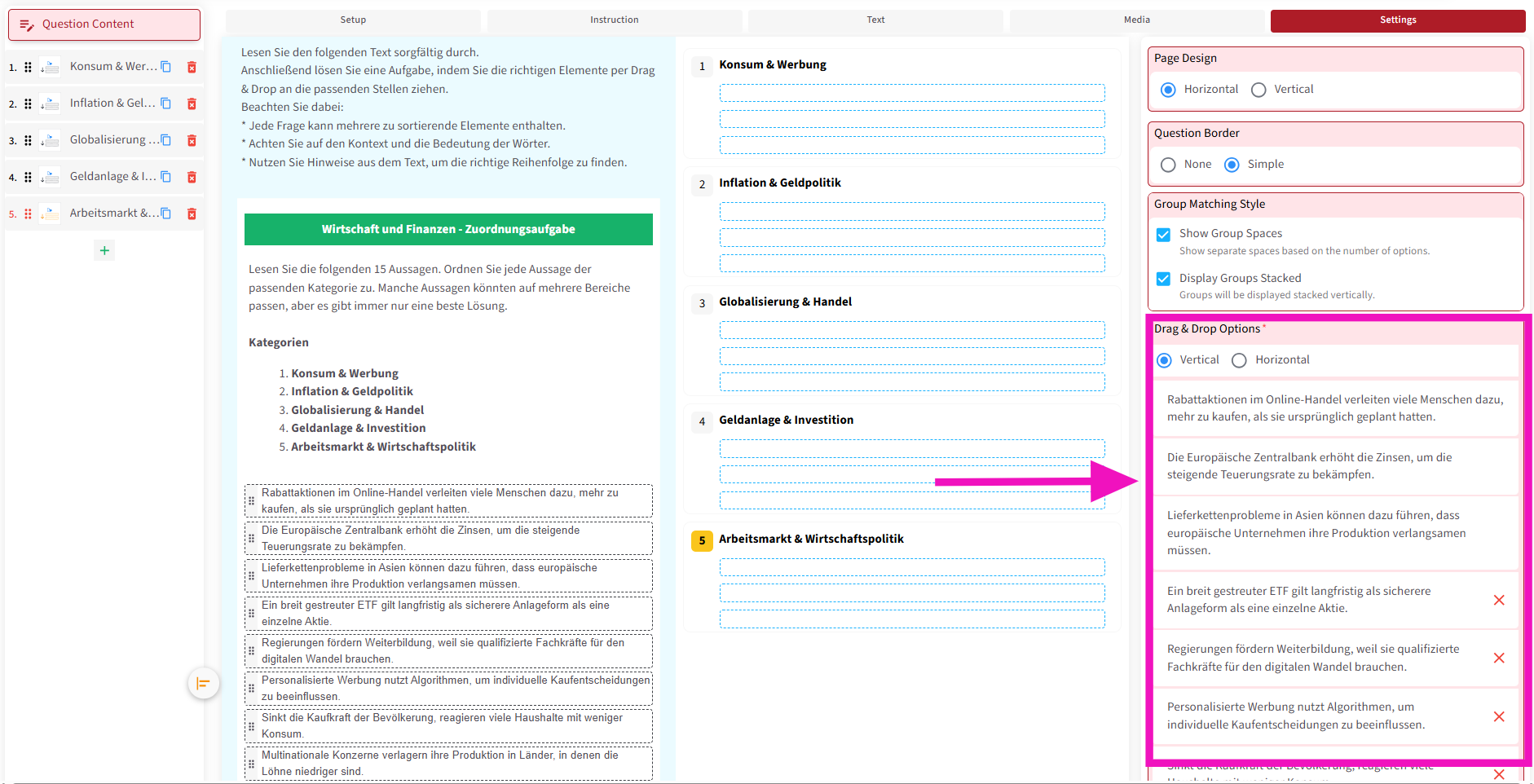 Im Bereich „Frageinhalt“ können im Abschnitt „Einstellungen“ die Matching-Optionen hinzugefügt werden. Die passenden Elemente für eine Drag-and-Drop-Frage können Wörter, Sätze oder auch längere Texte sein.