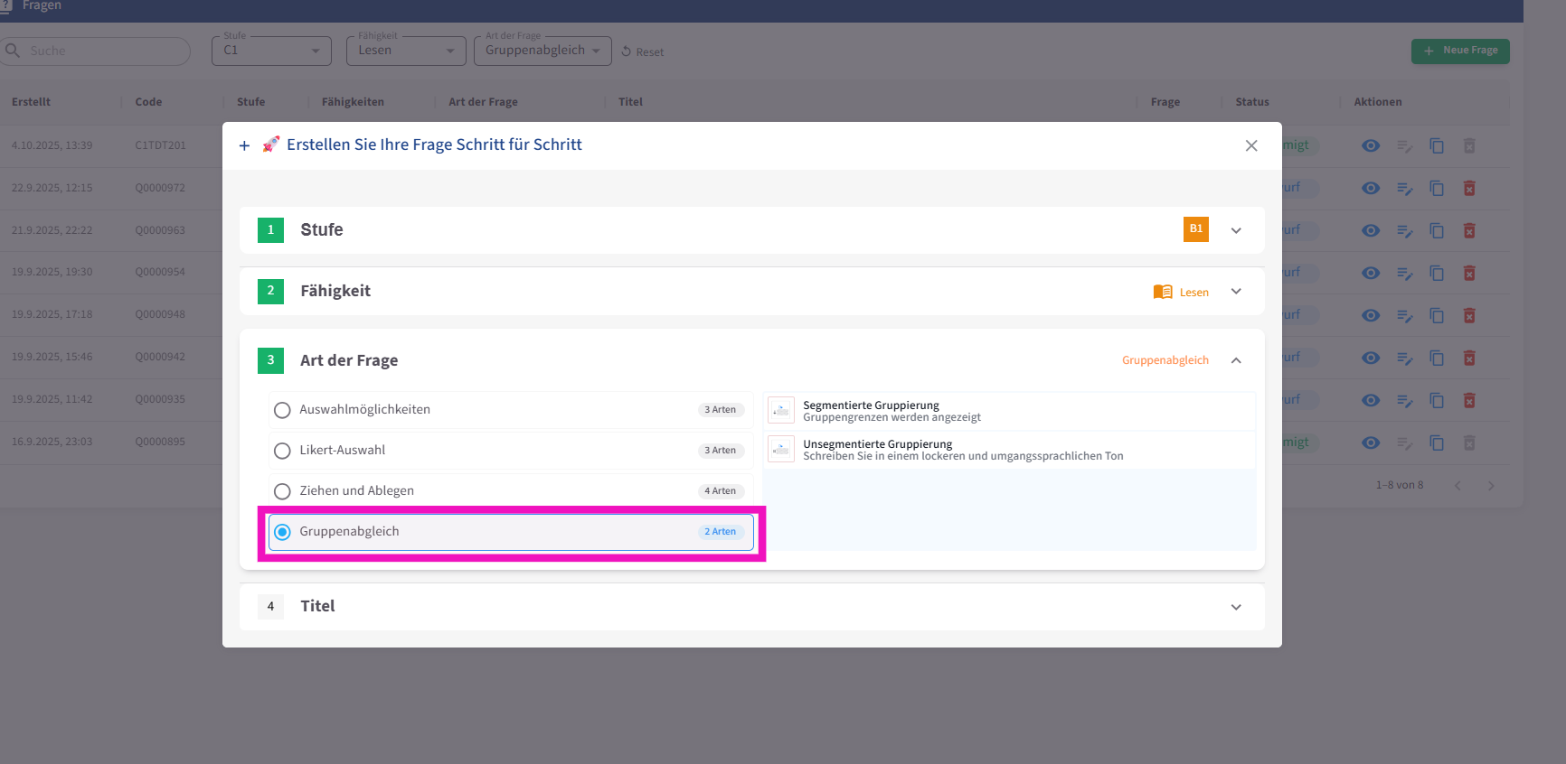 Um den Group-Matching-Fragetyp auszuwählen, klicken Sie im Bereich „Fragen“ auf „Neue Frage“ . Anschließend wählen Sie das gewünschte Sprachniveau und „Lesen“ aus und entscheiden sich dann für den Fragetyp „Group Matching“ .