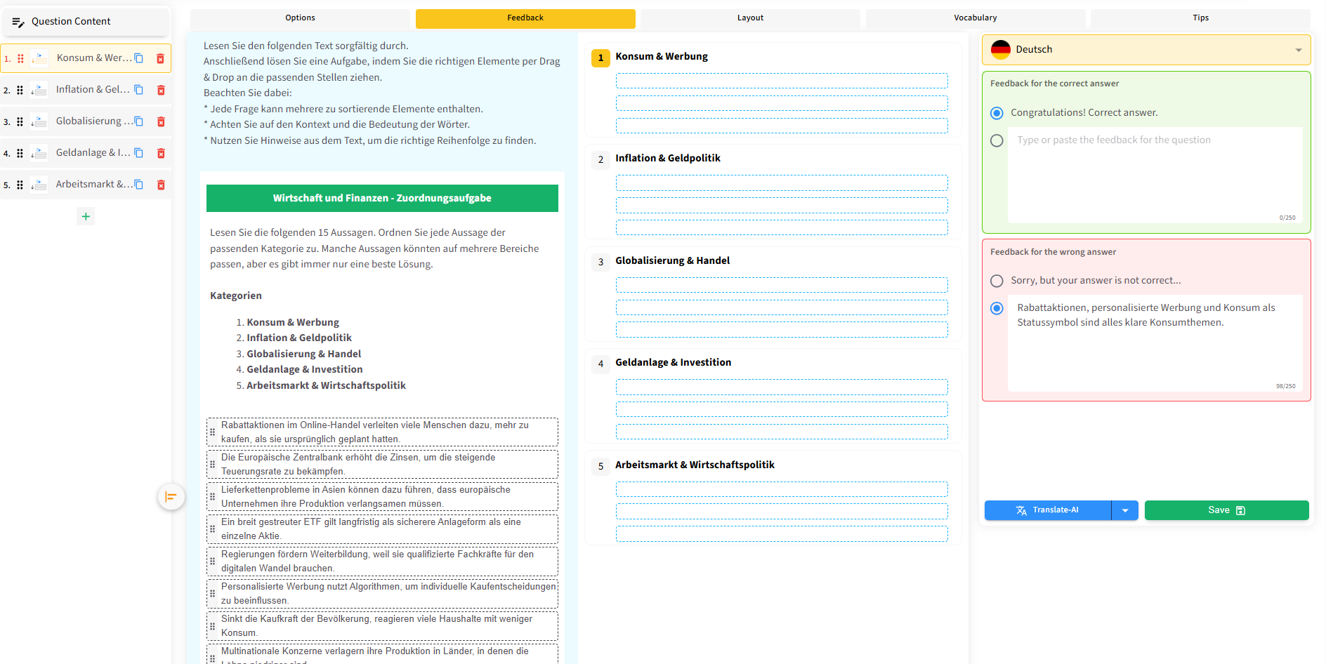 Wie bereits beim vorherigen Fragetyp wird das mehrsprachige Feedback im Bereich „Rückmeldung“ eingegeben.