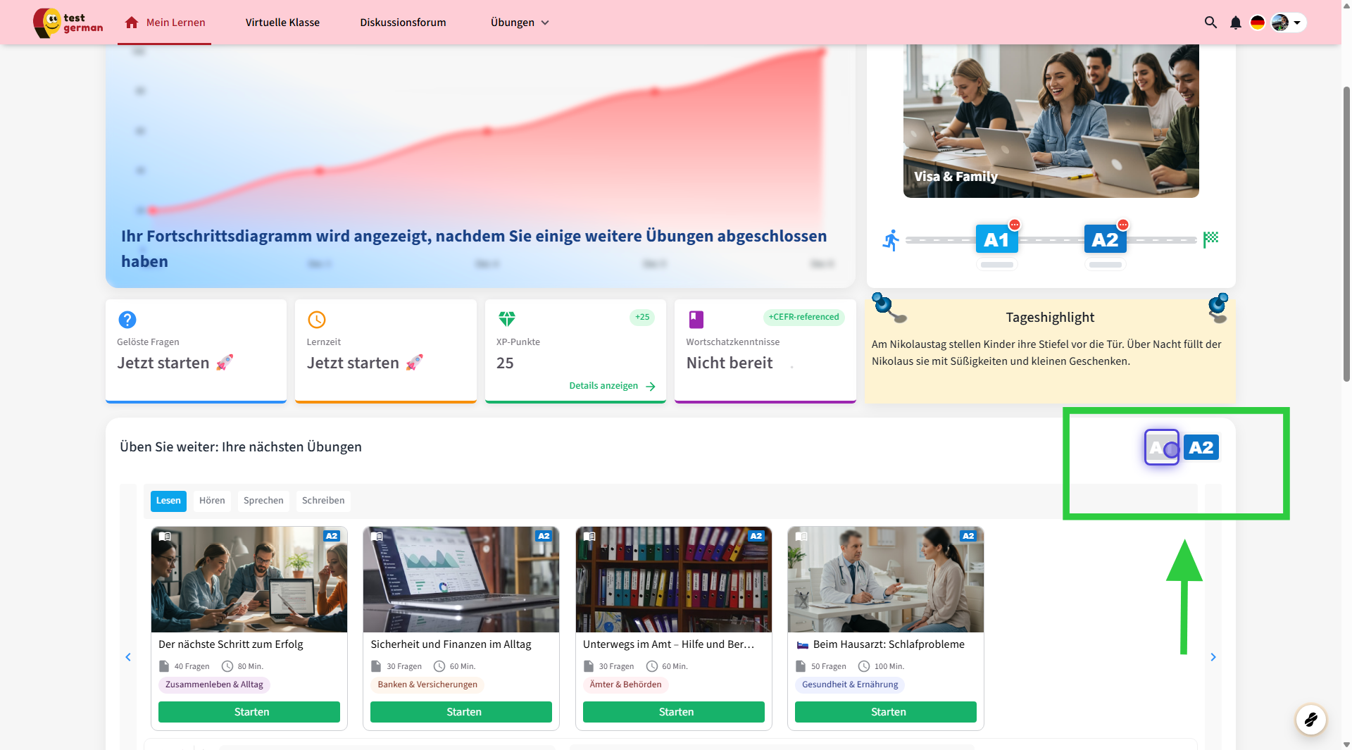 In diesem Fall können Sie auf dem Dashboard ganz einfach das Level auswählen, für das Sie Tests bearbeiten möchten.