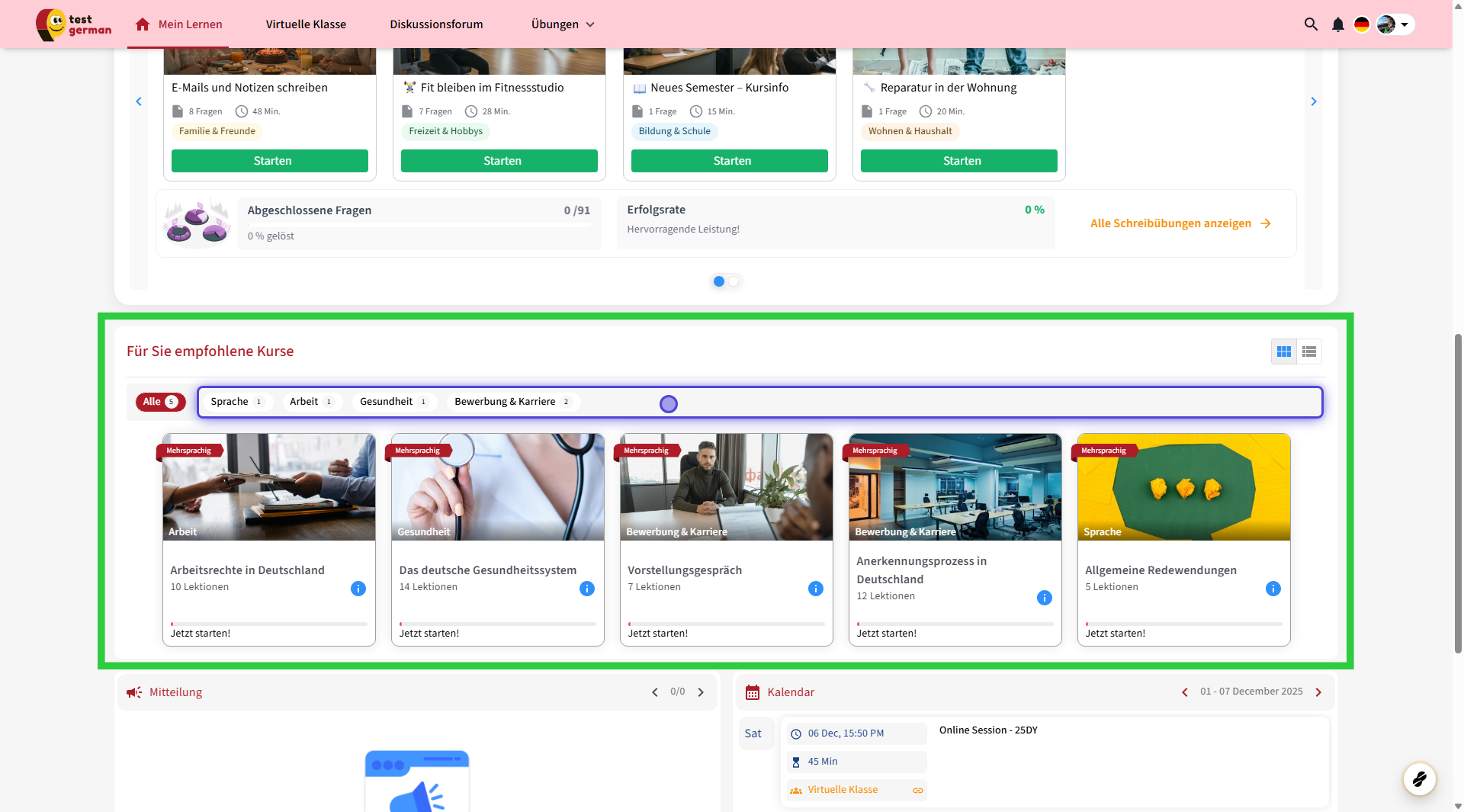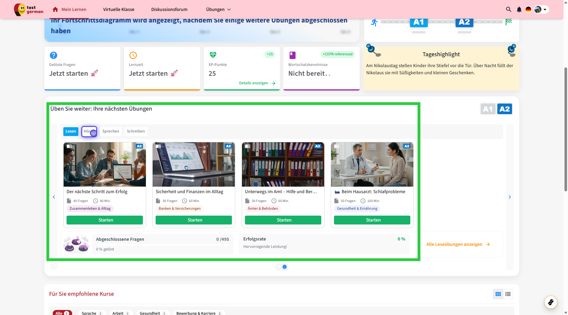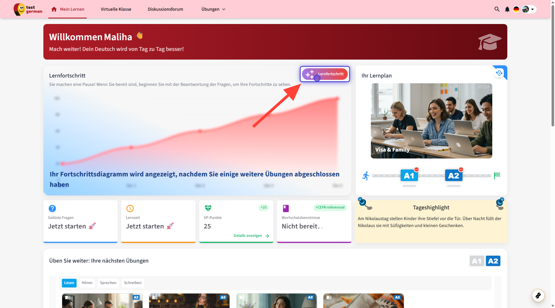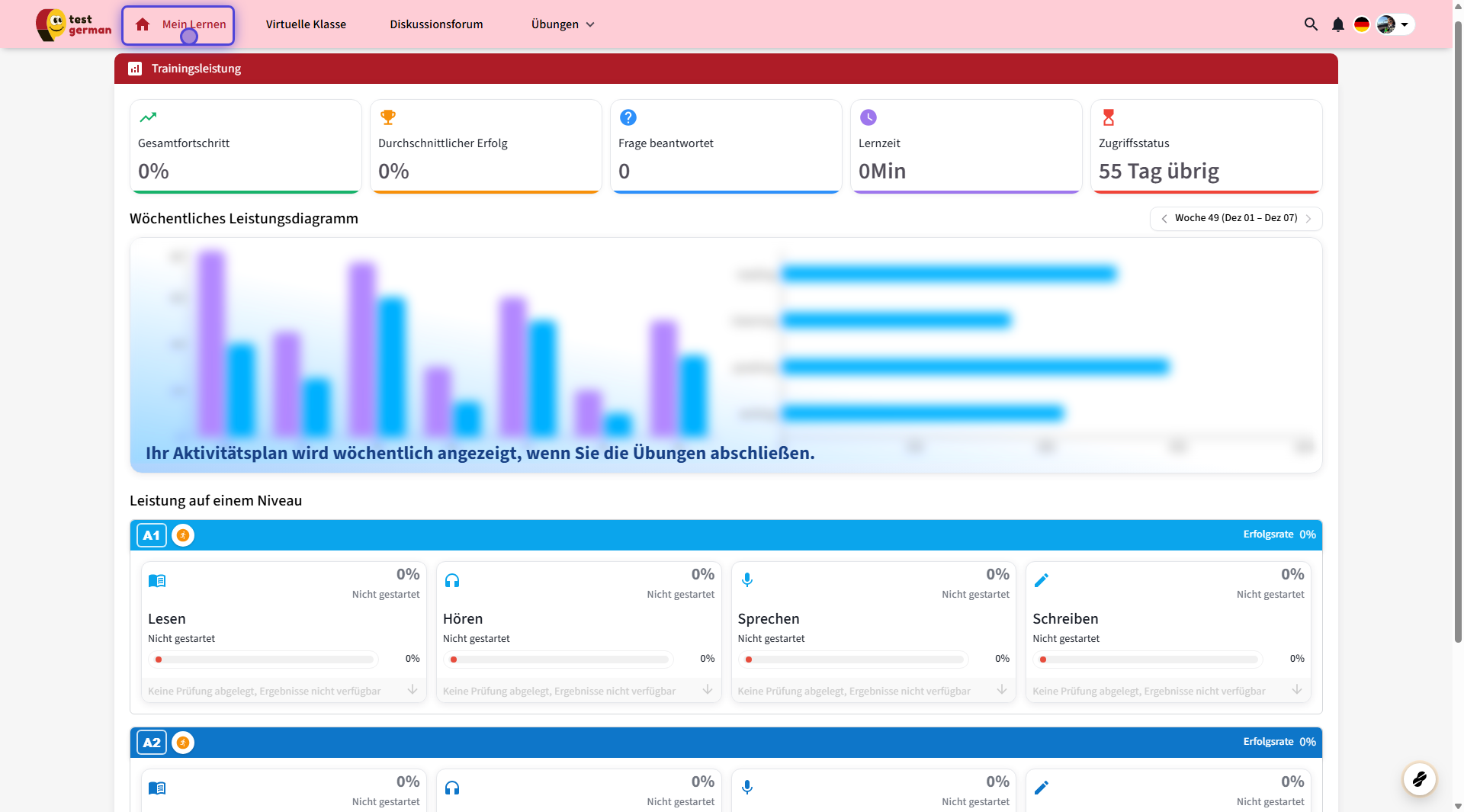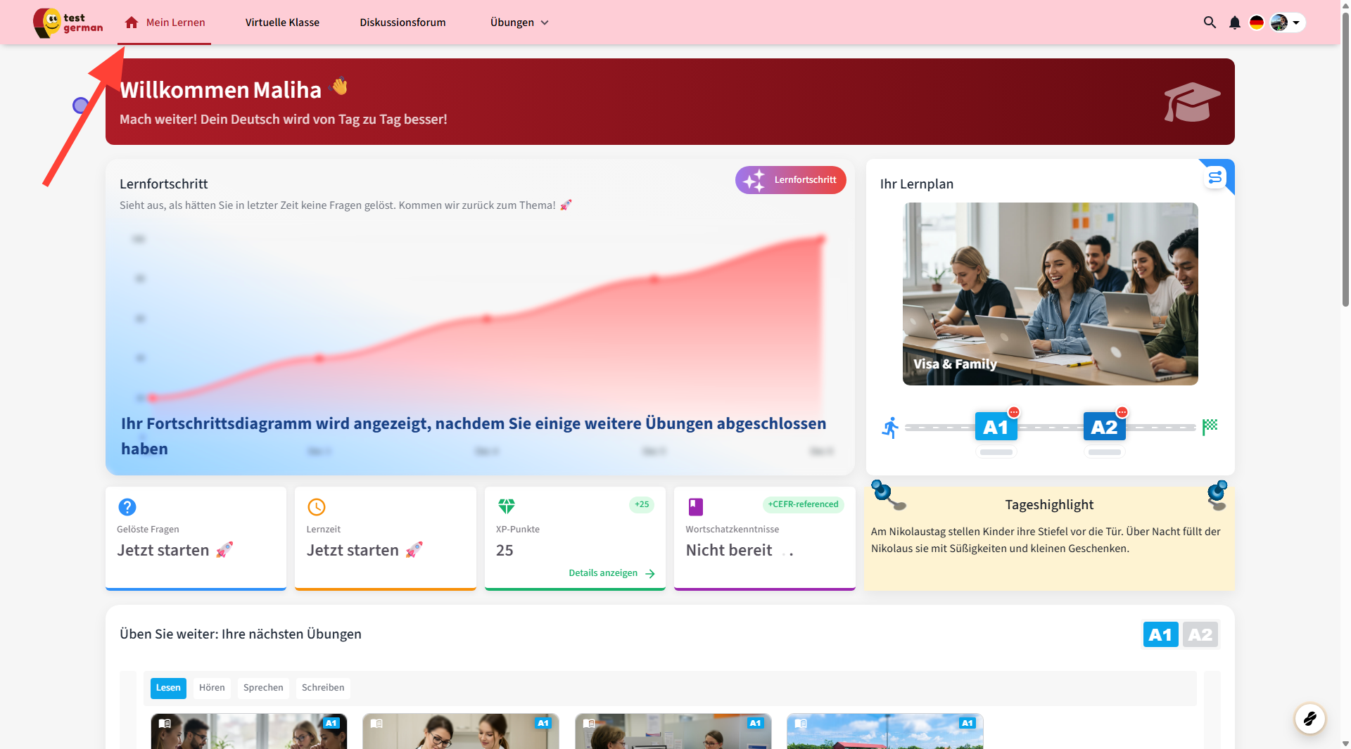 Im Folgenden erklären wir Ihnen Schritt für Schritt, was Sie im Bereich „Mein Lernen“ sehen und nutzen können.