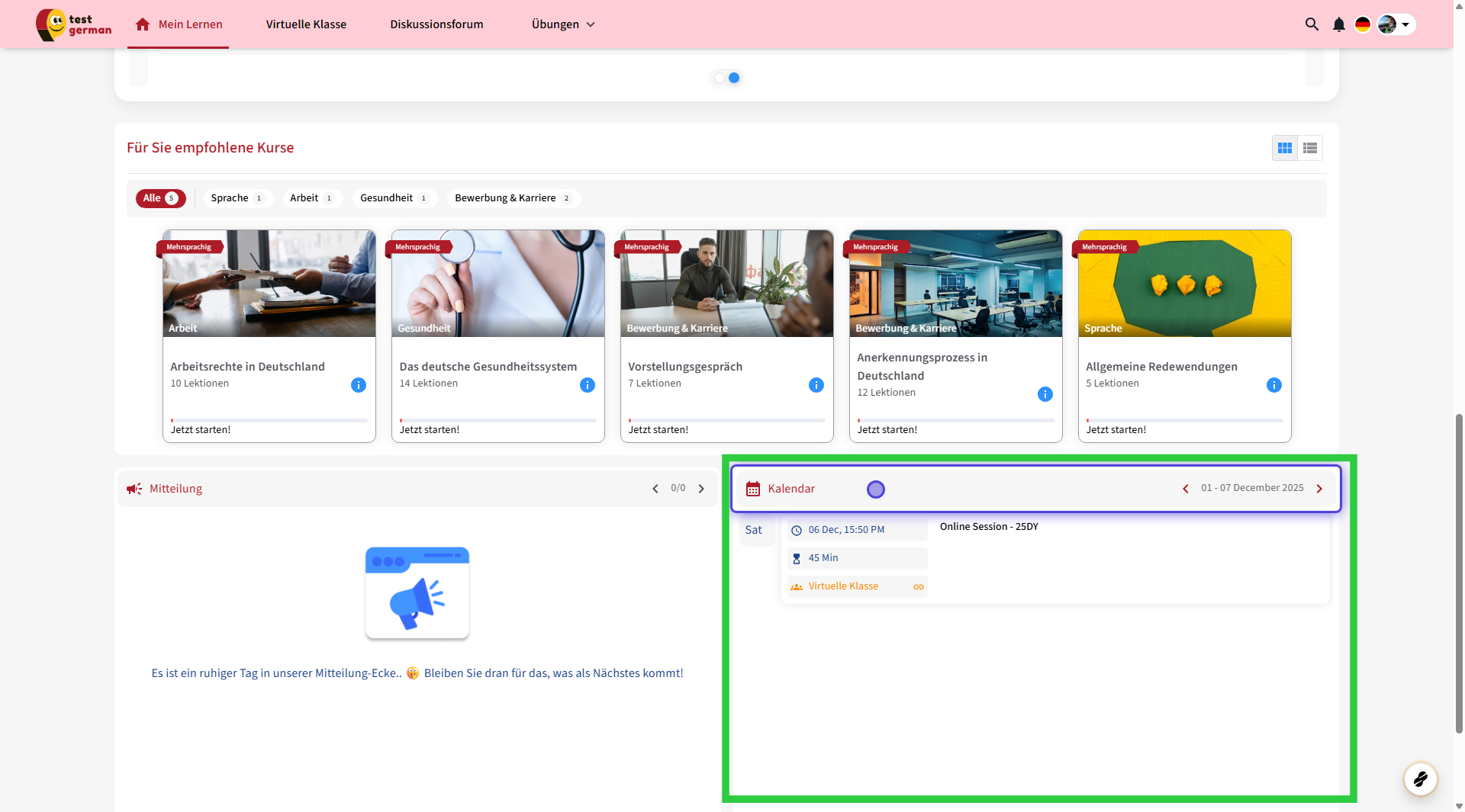 Im Kalender finden Sie Termine oder Besprechungslinks, die Ihnen von Ihrem Kursanbieter zugewiesen wurden.