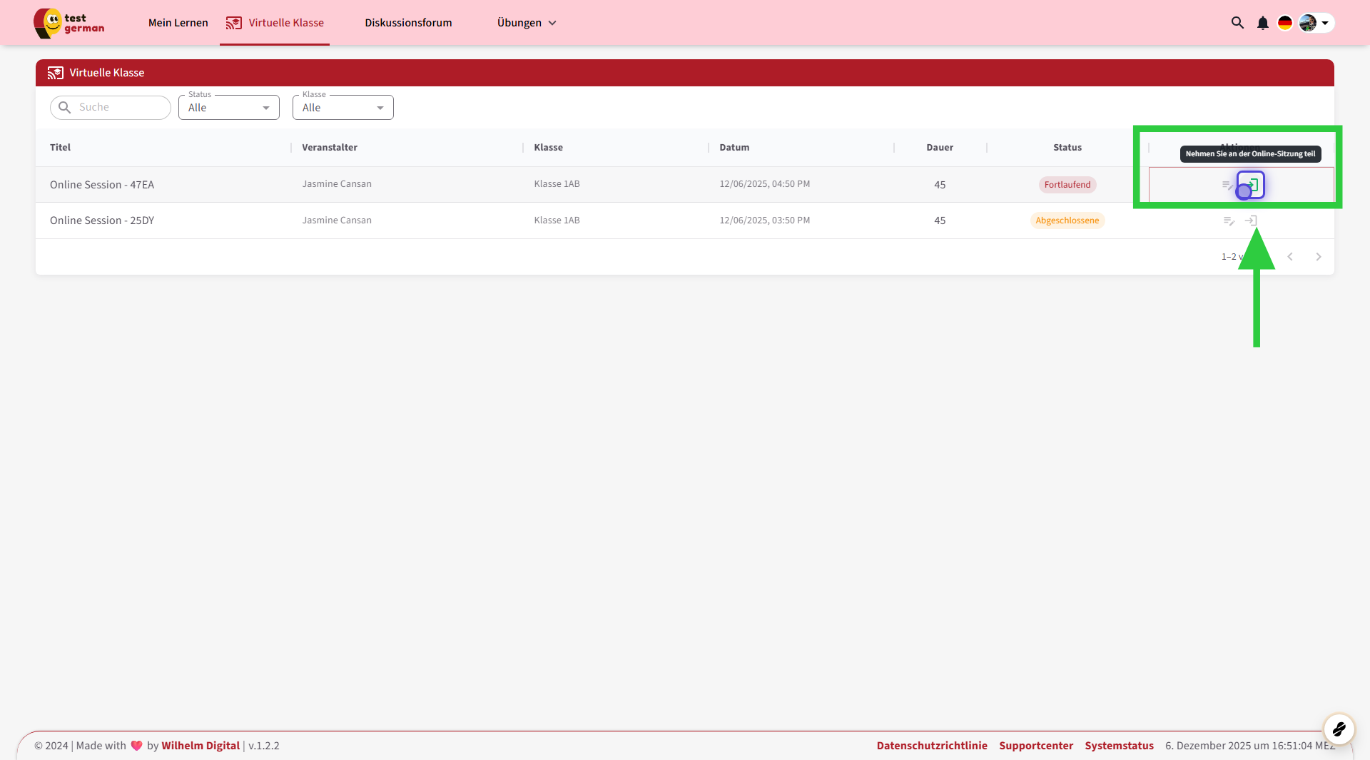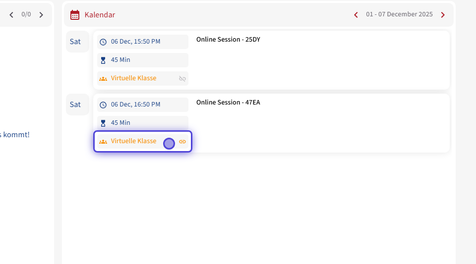 Klicken Sie einfach zur angegebenen Uhrzeit auf das Symbol der virtuellen Klasse im Kalender.