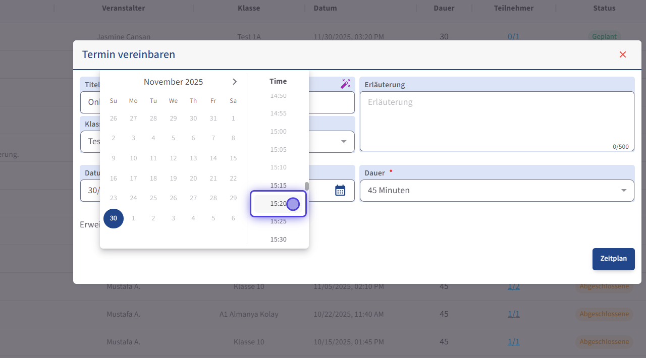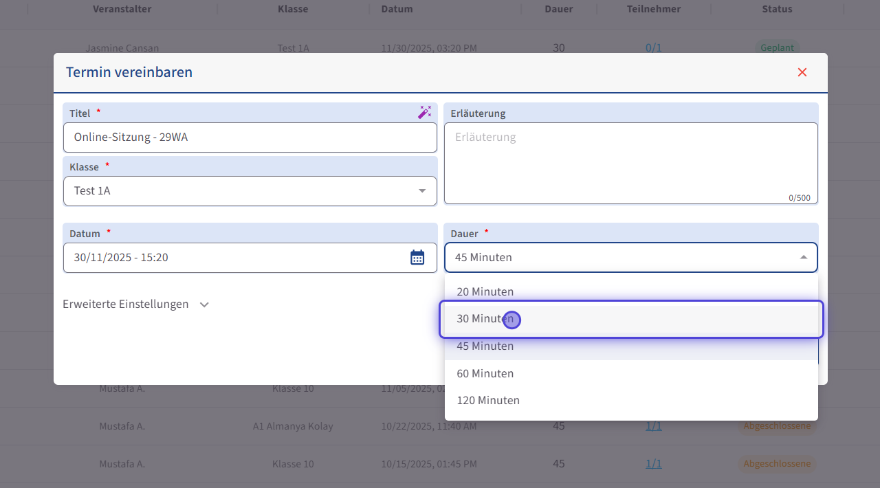 - 7. Legen Sie die Dauer fest.