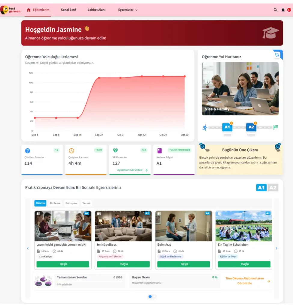 Goethe, telc ve TestDaF sınav tarihleri yaklaştığında, platform kullanıcıları anında bilgilendirilir ve deneme testleriyle sınav öncesi performanslarını ölçebilir. Bu sayede hem zamandan hem de maliyetten tasarruf edilir, sınava girerken güven duygusu maksimum seviyeye çıkar.